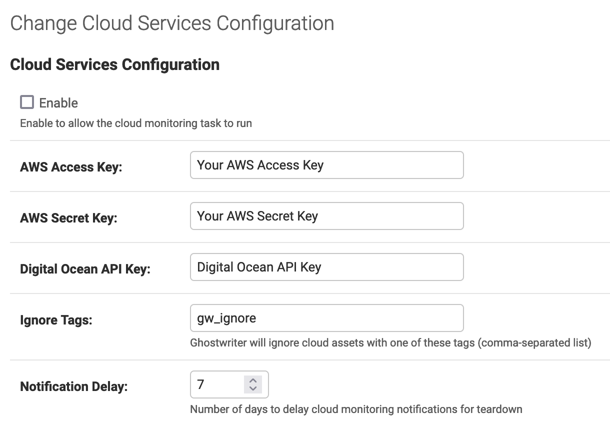 You may spin up cloud servers on the same account that you do not want to be monitored. You can tag these servers with an “ignore tag” of your choosing. Provide a comma-separated list of tags for Ghostwriter to ignore when checking cloud assets. If you use Slack notifications to send reminders to teardown cloud infrastructure, you can also provide a notification delay in days. Ghostwriter will wait to send reminders until a project’s end date + your delay.