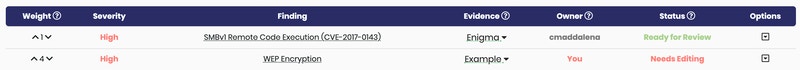Each local finding has a Status that defaults to Needs Editing. Once the owner has finished editing the finding and attached evidence files they click Mark as Complete from the dropdown menu under Options. This changes the status to Ready for Review, a sign to the assessment lead that the finding is complete and can be reviewed for finalizing the write-up. If the reviewer believes the finding needs more work, the Flag for Editing option will reverse the status.This is a preliminary version of the review workflow. Future versions will enable reviewers to leave comments, sign-off on findings, and track changes.